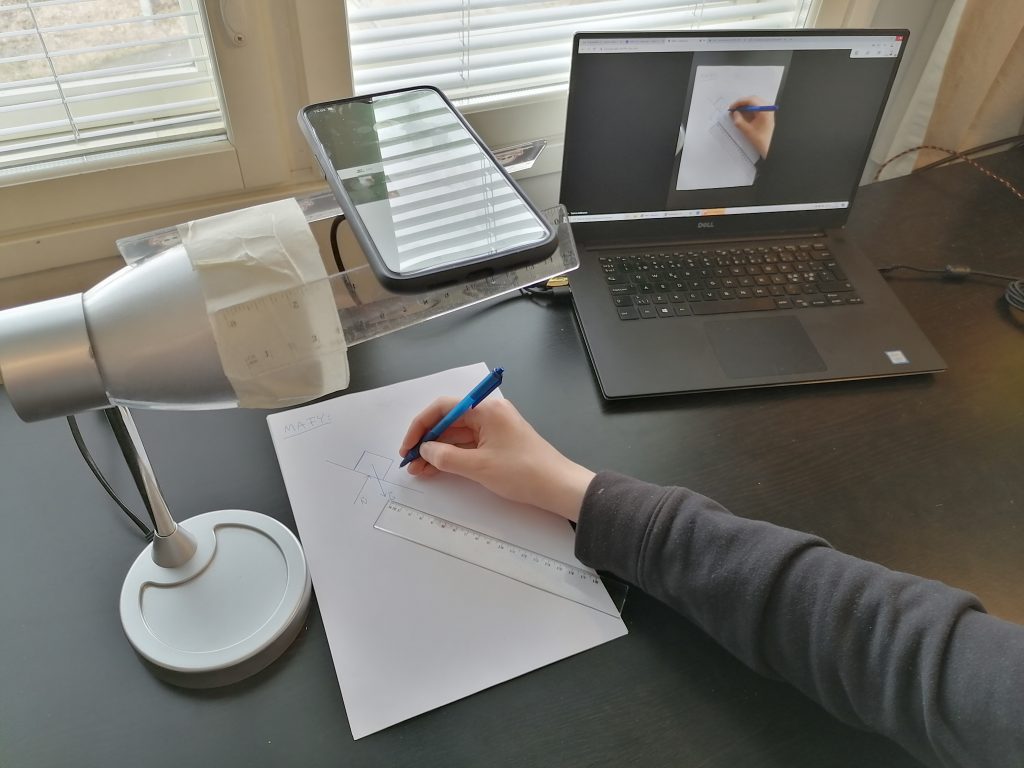 VINKKI: Opettaja voi liittyä samaan videopalaveriin myös kännykällä ja kiinnittää kännykän esimerkiksi teipillä lampun jalkaan tai käyttää erillistä webkameraa. Näin hän pystyy helposti saamaan kuvan samaan tyyliin kuin dokumenttikameralla sekä käydä paperilla tehtävää läpi opiskelijoille.