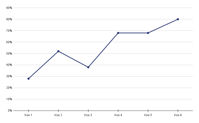Laske kokeesta suhteellinen tuloksesi: Omat pisteesi jaettuna sisäänpääsyrajalla kertaa 100 %. Jos esim. omat pisteesi ovat 19,9 ja sisäänpääsyraja 28,43, niin suhteellinen tulos on 19,9/28,43 * 100% = 69,9%. Suhteellinen tulos kertoo, että sinulla on vielä noin 30 prosenttiyksikköä matkaa sisäänpääsyrajaan. Piirrä suhteellisista tuloksista edistymiskuvaaja vihkoosi! Käytä jokaisen harjoituskokeen suhteellisen tuloksen laskemisessa saman hakukohteen sisäänpääsyrajoja. Katso kaksi esimerkkiä alta.