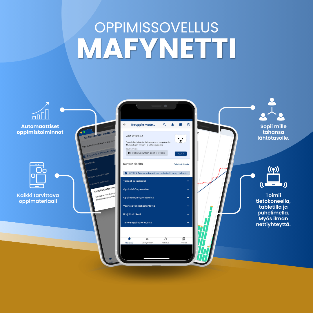- Varmista Mafynetin kertaustoiminnolla, että opit haastavammatkin aihealueet.