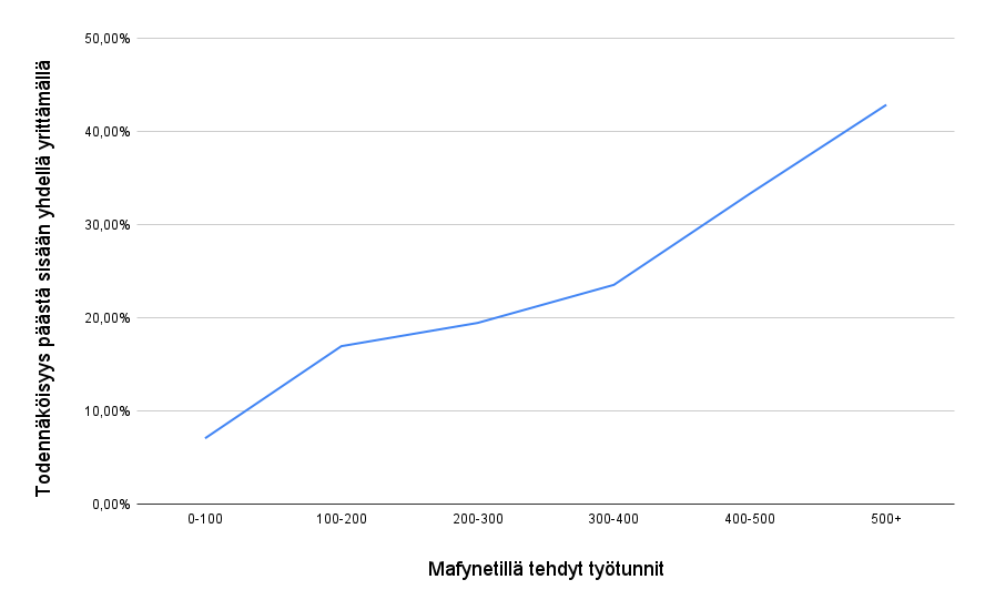 Oheisessa kuvaajassa näkyy Mafynetillä tehtyjen työtuntien vaikutus kauppatieteelliseen pääsyyn Mafynettiä keväällä 2023 käyttäneiden hakijoiden keskuudessa.