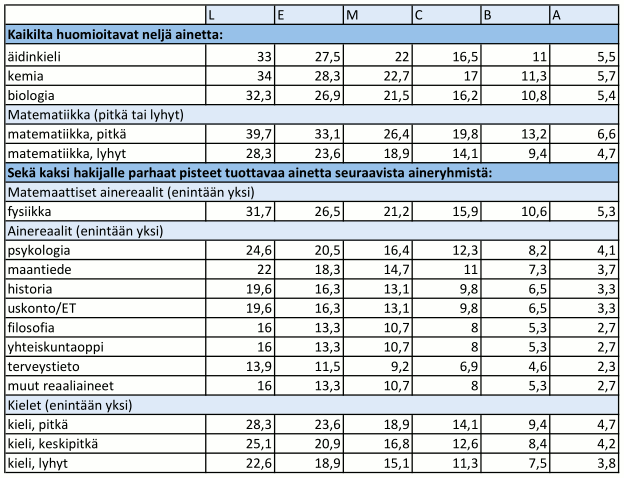 Todistuspisteitä annettiin yhteensä kuudesta yo-arvosanasta alla olevan taulukon mukaisesti: